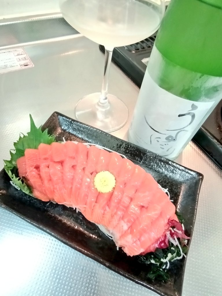 アテは岩手県産の大槌サーモンのお刺身と頂きます。