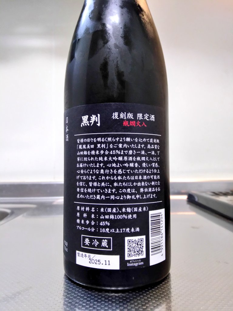 鳳凰美田 黒判 復刻判 です。こちらは時々行く酒屋さんで購入してきました。鳳凰美田はかなり久しぶりですね。こちら黒判も2019年ぶりのリリースだとか。