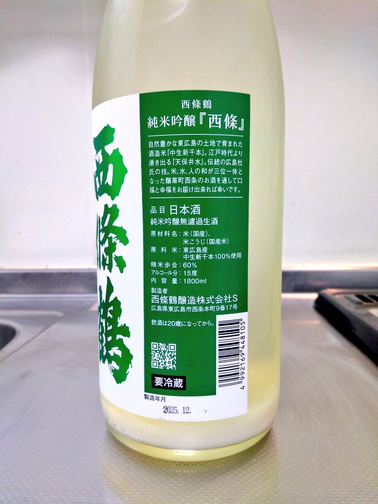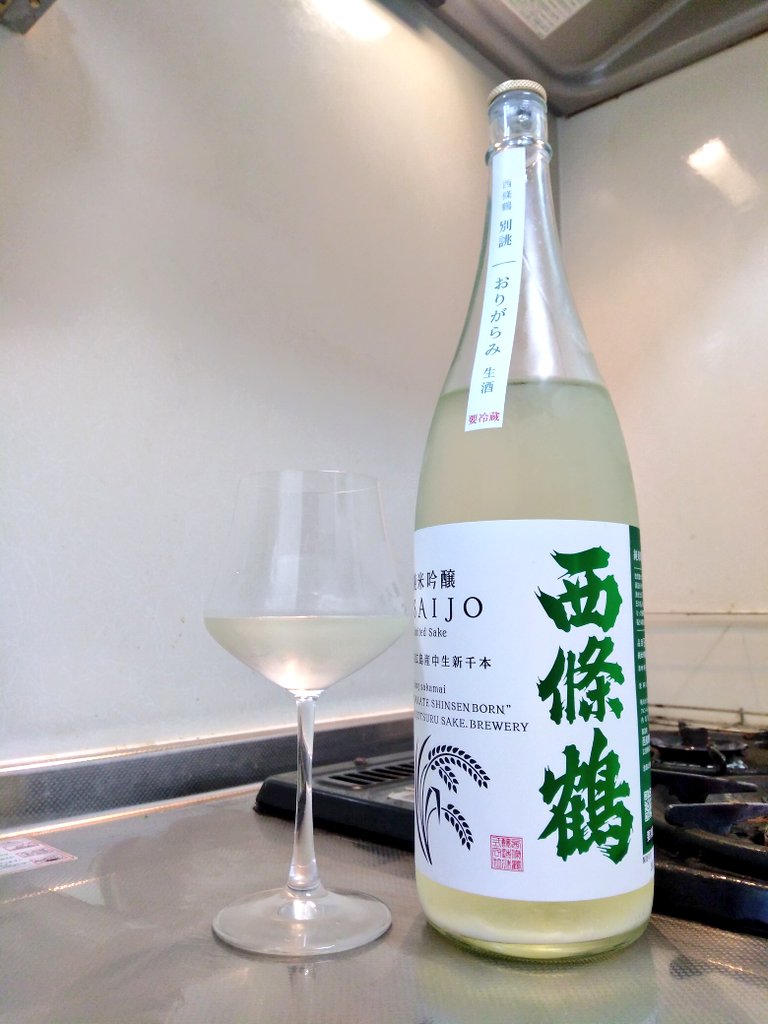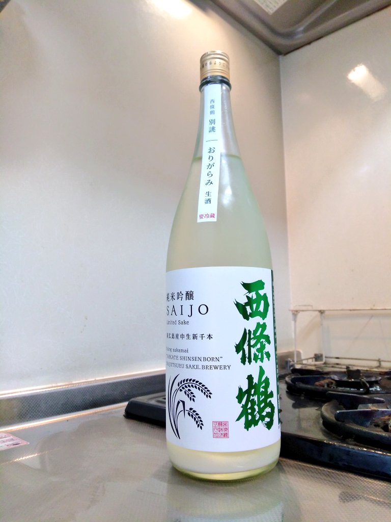西條鶴 純米吟醸 西條 別誂 おりがらみ 無濾過生原酒 です。こちらは時々行く酒屋さんで購入してきました。酒屋の会長さんに「何かおすすめありますか?」と尋ねたところ、「この西條鶴はいいですよ!値段も一升瓶で3000円で僕が指導して造らせたからね!」と満面の笑みでお勧めされた一本です。ちょいちょい前から気になっていた西條鶴。どんな味わいか楽しみですね。